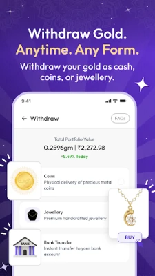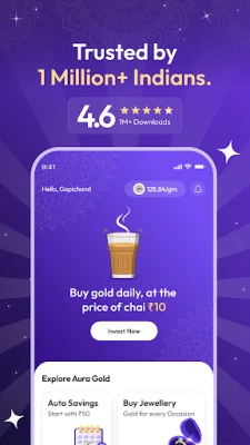 உங்கள் கைகளில் தங்க முதலீட்டின் சக்தியை அனுபவியுங்கள்! "ஆரா கோல்ட்" செயலி மூலம், தங்கம் வாங்குவதும் விற்பதும் எப்போதும் இவ்வளவு எளிதாக இருந்ததில்லை. வெறும் ₹10 முதலீட்டில் தொடங்கி, உங்கள் சேமிப்பை மெதுவாக வளர விடுங்கள். நிகழ்நேர தங்க விலைகளை கண்காணித்து, சரியான நேரத்தில் அறிவார்ந்த முடிவுகளை எடுப்பதன் மூலம் உங்கள் தங்கப் பயணத்தைத் தொடங்குங்கள். டிஜிட்டல் தங்கத்தின் வசதி மற்றும் பாதுகாப்பைப் பயன்படுத்தி, உங்கள் செல்வத்தை பெருக்குவதற்கான வாய்ப்பை "ஆரா கோல்ட்" உங்களுக்கு வழங்குகிறது.