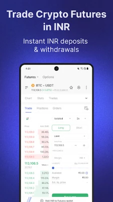 CoinDCX Bitcoin & crypto trading app ஒரு ஒருங்கிணைந்த தளமாக, வர்த்தகர்களுக்கு பலவிதமான அம்சங்களை வழங்குகிறது. உங்கள் ரசனைக்கு ஏற்றவாறு லைட் மற்றும் டார்க் மோட்களை மாற்றிக்கொள்ளும் வசதி இதில் உள்ளது. Bitcoin, Ethereum மற்றும் முதல் 10 கிரிப்டோகரன்சிகளில் 100x வரை லீவரேஜுடனும், 300க்கும் மேற்பட்ட கிரிப்டோ ஃபியூச்சர்ஸ் ஜோடிகளில் 50x வரை லீவரேஜுடனும் வர்த்தகம் செய்யலாம். 1000க்கும் மேற்பட்ட கிரிப்டோகரன்சிகளுடன் ஸ்பாட் வர்த்தகம் மற்றும் குறைந்த கட்டணங்கள் மூலம் இலாப வாய்ப்புகளை அதிகரிக்கும். பிரத்யேக கிரிப்டோ ஃபியூச்சர்ஸ் வாலட் மற்றும் கிராஸ் மார்ஜின் மூலம் வருவாயை மேம்படுத்துங்கள். Web3 Mode மூலம் 50,000க்கும் அதிகமான டோக்கன்கள் மற்றும் புதிய டோக்கன்களுக்கான நேரடி அணுகலைப் பெற்று, அடுத்த தலைமுறை கிரிப்டோ அனுபவத்தைப் பெறுங்கள்.
