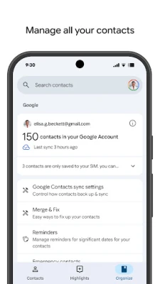 Contacts: உங்கள் தொடர்புகளை Google கணக்கில் பாதுகாப்பாக காப்புப் பிரதி எடுத்து, சாதனங்கள் முழுவதும் ஒத்திசைக்கவும். நீக்கியவற்றை மீட்டெடுக்கவும், நகல்களை ஒன்றிணைக்கவும், பிறந்தநாள் போன்ற முக்கிய விவரங்களை நிர்வகிக்கவும் இது உதவும்.