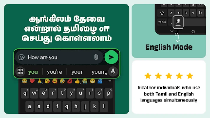 உங்கள் உரையாடல்களை மேலும் சுவாரஸ்யமாக்க, Desh Tamil Keyboard பிரத்யேக அம்சங்களுடன் வருகிறது. WhatsApp மற்றும் பிற மெசேஜிங் ஆப்களில் பயன்படுத்த கவர்ச்சிகரமான ஸ்டிக்கர் தொகுப்புகள், உங்கள் சொந்தப் புகைப்படங்களில் இருந்து ஸ்டிக்கர்களை உருவாக்கும் வசதி, ஸ்டைலான எழுத்துருக்கள், எளிதில் அணுகக்கூடிய ஈமோஜி வரிசை, மற்றும் பல வண்ணமயமான தீம்கள் உங்கள் செய்திகளுக்கு ஒரு தனித்துவமான அழகைச் சேர்க்கும். உங்கள் விரல் நுனியில் முழுமையான தனிப்பயனாக்கம் உள்ளது; வண்ணங்கள், பின்னணிப் படங்கள் அல்லது உங்கள் சொந்தப் புகைப்படங்களைக்கூட விசைப்பலகையின் பின்னணியாக அமைக்கலாம். ஸ்பேஸ்பார் அருகில் உள்ள தனிப்பயன் மொழி விசை மூலம், தமிழ் மற்றும் ஆங்கிலம் இடையே நொடிப்பொழுதில் மாறலாம் அல்லது நீண்ட நேரம் அழுத்தி மற்ற தட்டச்சு முறைகளைத் தேர்வு செய்யலாம்.